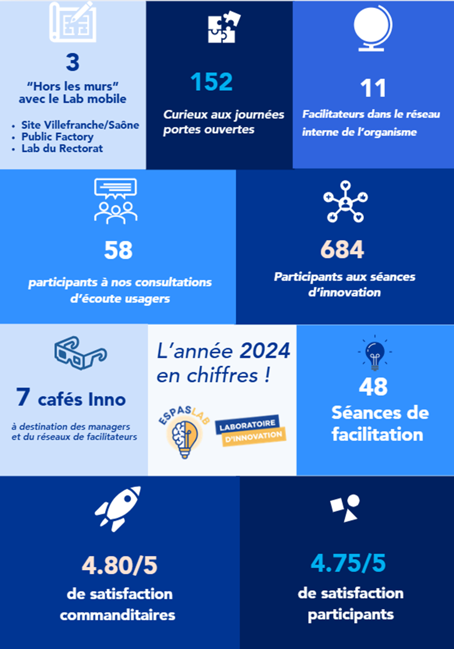 Tout au long de l’année, l’EspasLab a multiplié les occasions de mettre en pratique sa mission : offrir un espace collaboratif où émergent, se testent et se prototypent des solutions innovantes proposées par les agents. 684 participants ont ainsi pris part aux séances d’innovation, animées par les facilitateurs et super-facilitateurs. Le réseau compte désormais 11 facilitateurs actifs, renforcé par des temps de formation et de sensibilisation aux pratiques de facilitation.